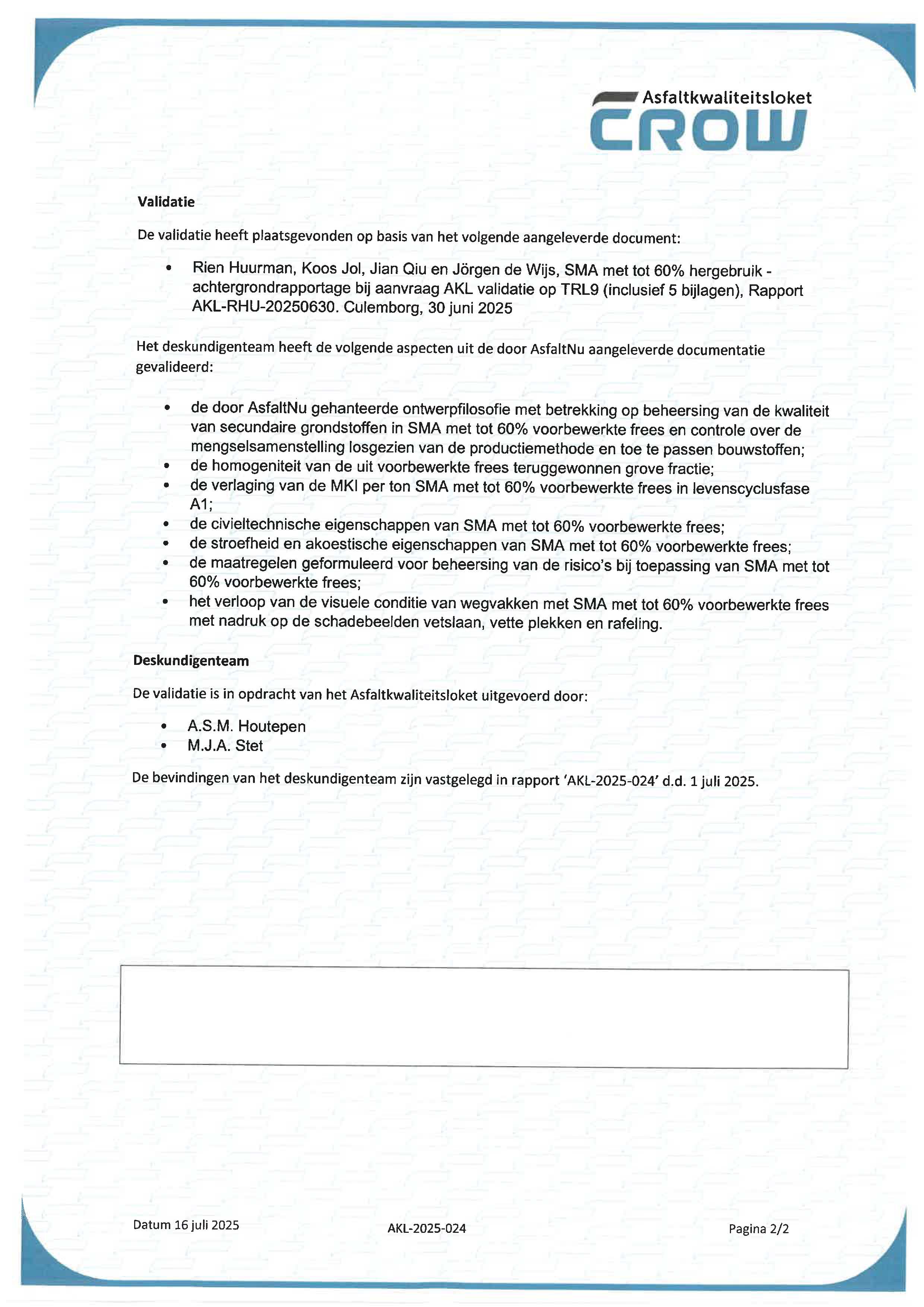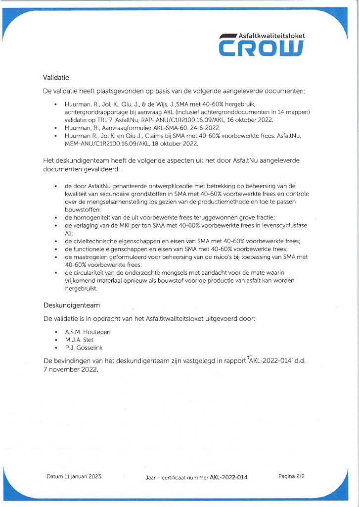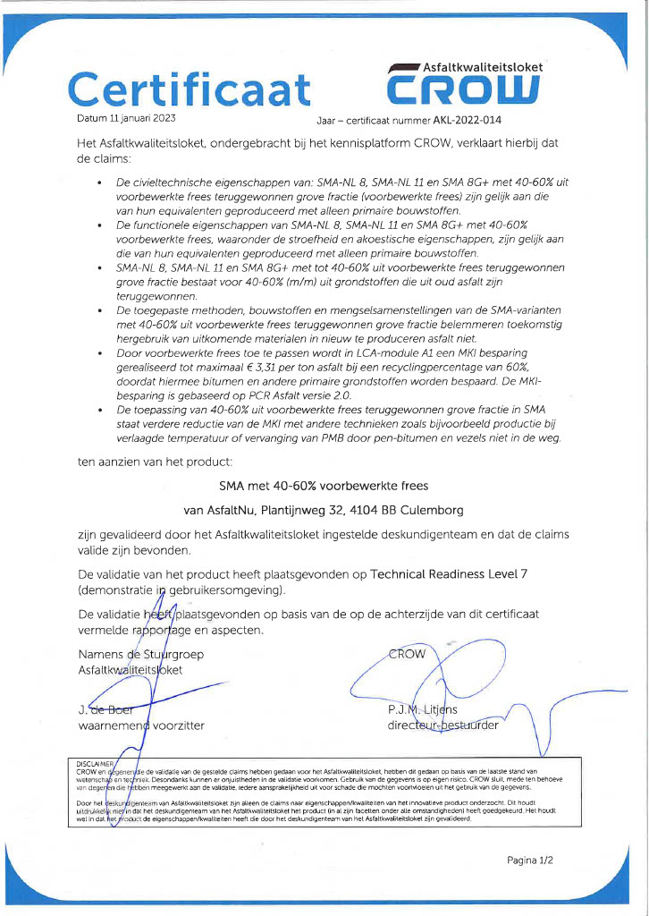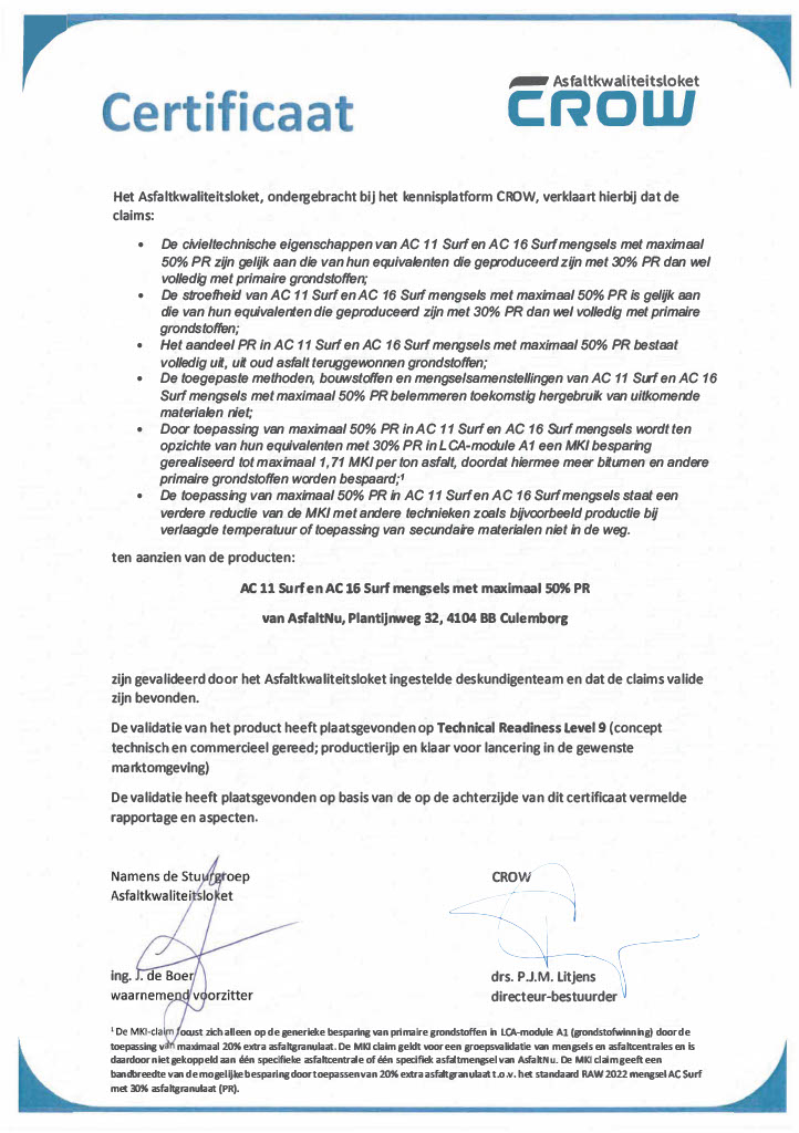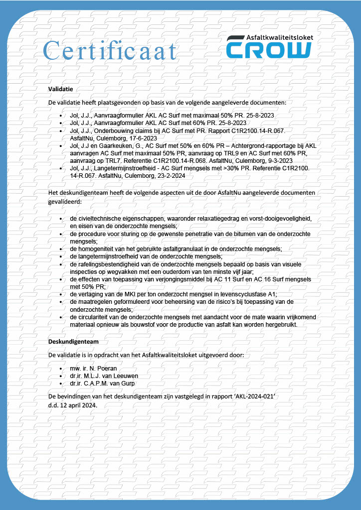 AsfaltNu heeft van het AsfaltKwaliteitsLoket de TRL9-validatie ontvangen voor de volledige SMA-familie met tot 60% hergebruik. Met validatiecertificaat AKL-2025-024 bevestigt het AsfaltKwaliteitsLoket dat AsfaltNu in staat is met nieuwe technologieën en circulaire grondstoffen minimaal gelijkwaardig presterende mengsels te maken die in de praktijk bijdragen aan een klimaatvriendelijke en toekomstbestendige infrastructuur. Op maandag 13 oktober jl. overhandigde Pieter Litjens, directeur van CROW, namens het AsfaltKwaliteitsLoket het certificaat aan Rien Huurman (Raadgevend R&D Adviseur) en Koos Jol (R&D adviseur en beheerder mengselportfolio) van AsfaltNu. De validatie omvat de SMA-varianten SMA-NL 8B, SMA-NL 11B en SMA 8G+, zowel voor regulier Hot Mix Asfalt (HMA) als LEAB Warm Mix Asfalt (WMA).
