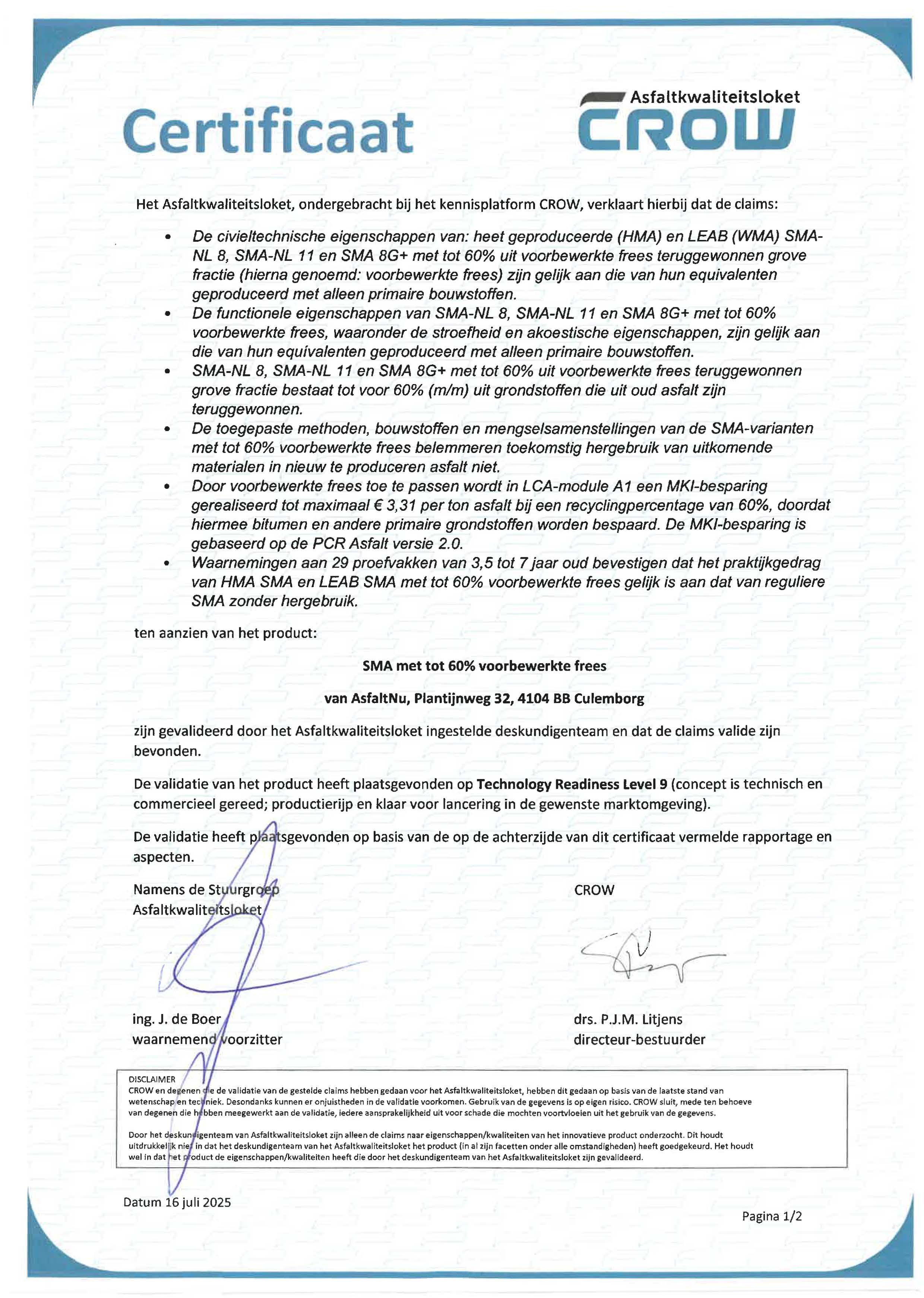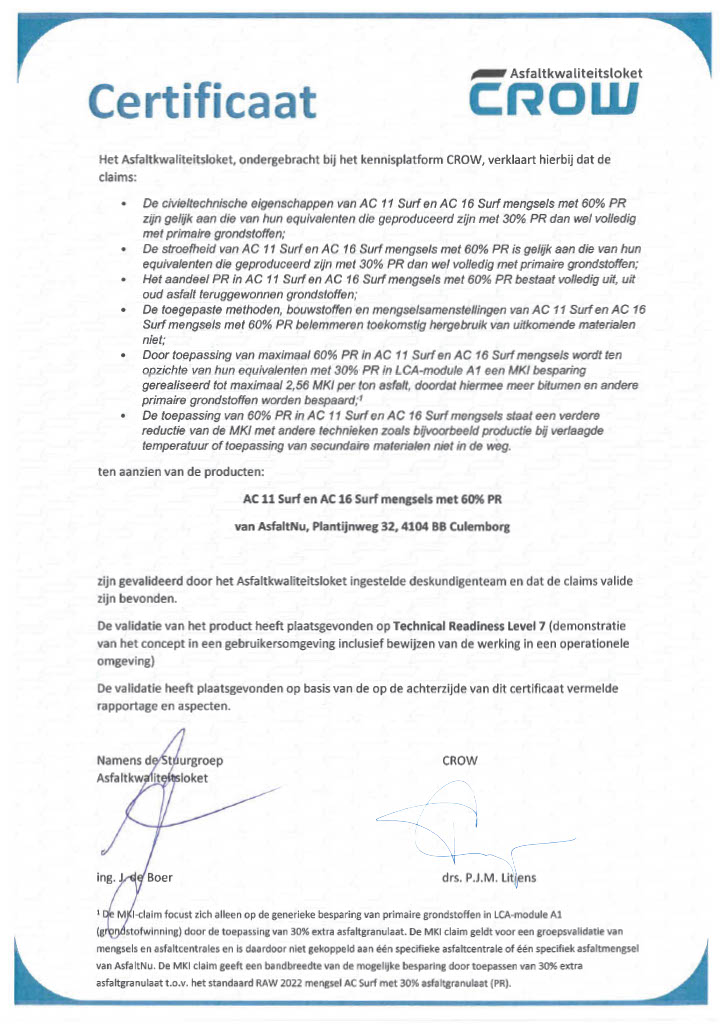 AsfaltNu heeft van het AsfaltKwaliteitsLoket de TRL9-validatie ontvangen voor de volledige SMA-familie met tot 60% hergebruik. Met validatiecertificaat AKL-2025-024 bevestigt het AsfaltKwaliteitsLoket dat AsfaltNu in staat is met nieuwe technologieën en circulaire grondstoffen minimaal gelijkwaardig presterende mengsels te maken die in de praktijk bijdragen aan een klimaatvriendelijke en toekomstbestendige infrastructuur. Op maandag 13 oktober jl. overhandigde Pieter Litjens, directeur van CROW, namens het AsfaltKwaliteitsLoket het certificaat aan Rien Huurman (Raadgevend R&D Adviseur) en Koos Jol (R&D adviseur en beheerder mengselportfolio) van AsfaltNu. De validatie omvat de SMA-varianten SMA-NL 8B, SMA-NL 11B en SMA 8G+, zowel voor regulier Hot Mix Asfalt (HMA) als LEAB Warm Mix Asfalt (WMA).